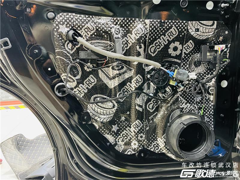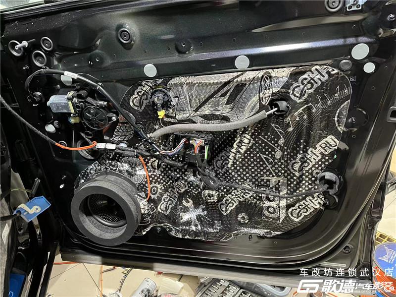好的声音离不开好的箱体。我们首先使用俄罗斯STP CSH小炸弹对四个门板进行双层隔音处理。抑制车门共振,阻隔噪音传递。隔音形成的箱体结构也使喇叭的声音更加厚实动听。